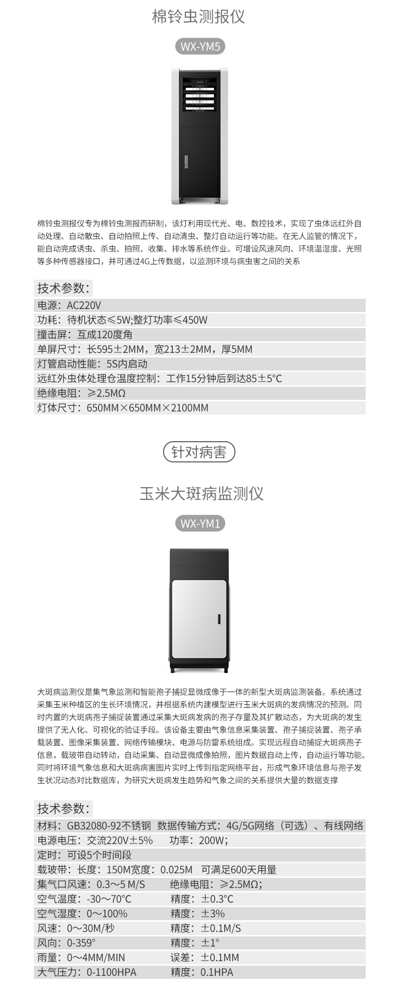 棉鈴蟲是一種世界性的重要經(jīng)濟害蟲,在我國分布廣泛。其寄主植物廣泛,繁殖能力強,大發(fā)生時給農(nóng)業(yè)生產(chǎn)帶來重大的經(jīng)濟損失。棉鈴蟲測報儀專為棉鈴蟲測報而研制,該燈利用現(xiàn)代光、電、數(shù)控技術,實現(xiàn)了蟲體遠紅外自動處理、自動散蟲、自動拍照上傳、自動清蟲、整燈自動運行等功能。在無人監(jiān)管的情況下,能自動完成誘蟲、殺蟲、拍照、收集、排水等系統(tǒng)作業(yè)。可增設風速風向、環(huán)境溫濕度、光照等多種傳感器接口,并可通過4G上傳數(shù)據(jù),以監(jiān)測環(huán)境與病蟲害之間的關系。廣泛應用于棉鈴蟲蟲害監(jiān)測。